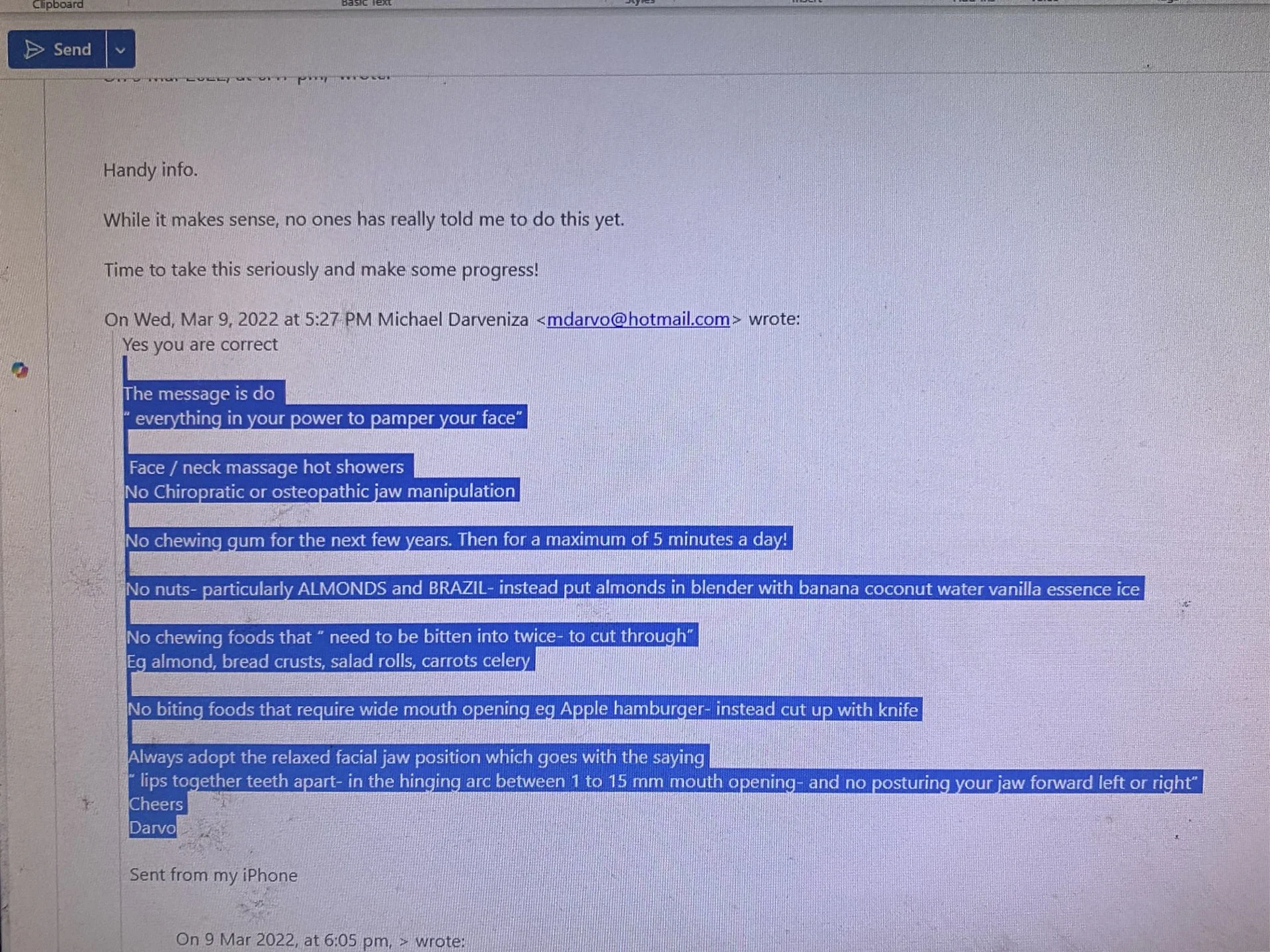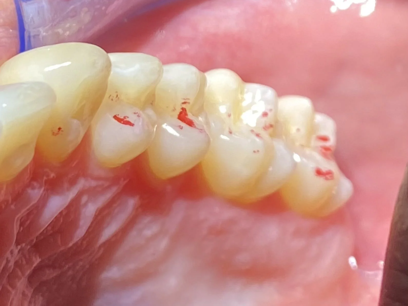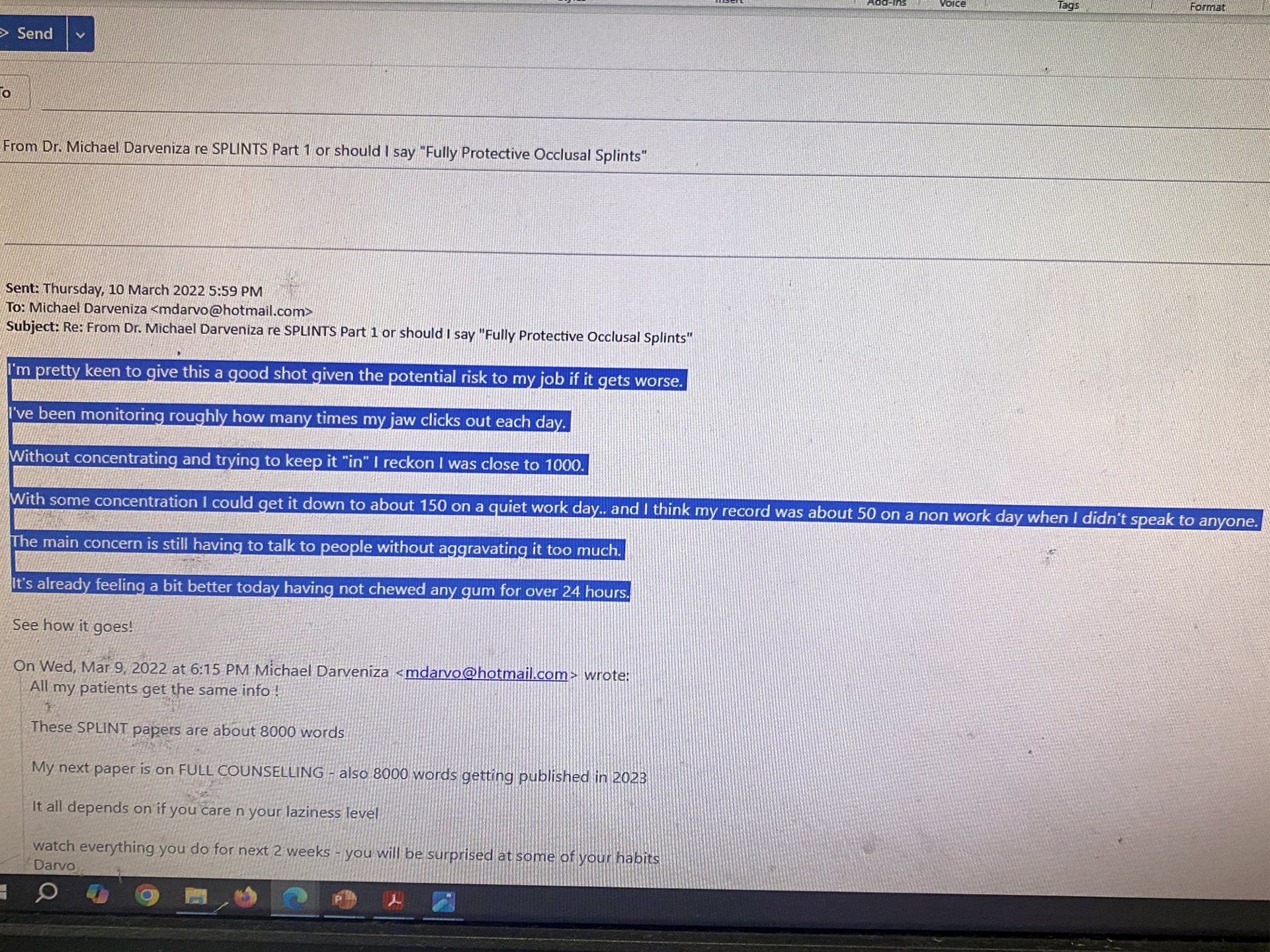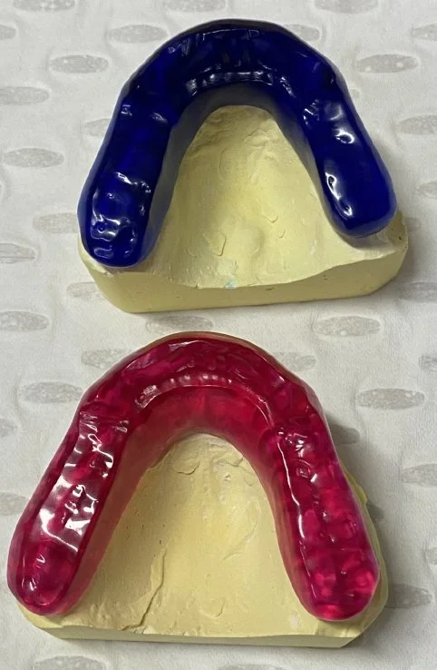 A TMJ Disorder patient requires conservative management with “Full Occlusal Therapy” in 3 stages along with concurrent Full Counselling (refer to journal papers 19 and 20). In other words, we need to get the disc back into the centre of the joint where it belongs starting with Full Counselling and then a Fully Protective Occlusal Splint (Stage 1). This splint is made of acrylic resin (used for dentures) and can be made in clear resin but is usually coloured blue or pink to hide any future discolouration (as in the photos below). The splint usually fits the upper teeth and only one is required.